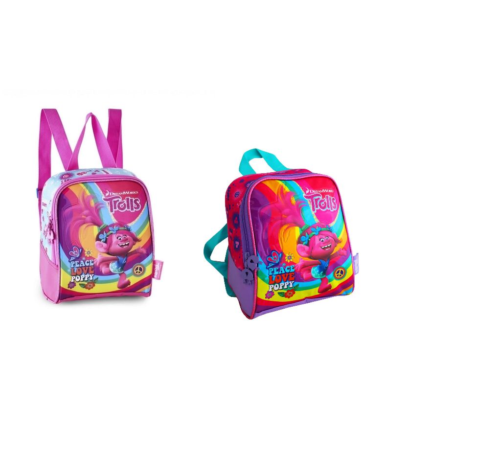 As lancheiras da linha Trolls são confeccionadas em cetim, com frente em PVC prensado. Ainda tem detalhes em Glitter e os puxadores são personalizados!