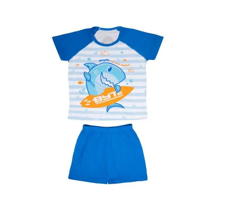 Feito em material super confortável e com tecido leve, ideal pra uma noite agradável de sono, o pijama também conta com estampa lúdica e divertida. Seu menino vai amar dormir com os tubarões.