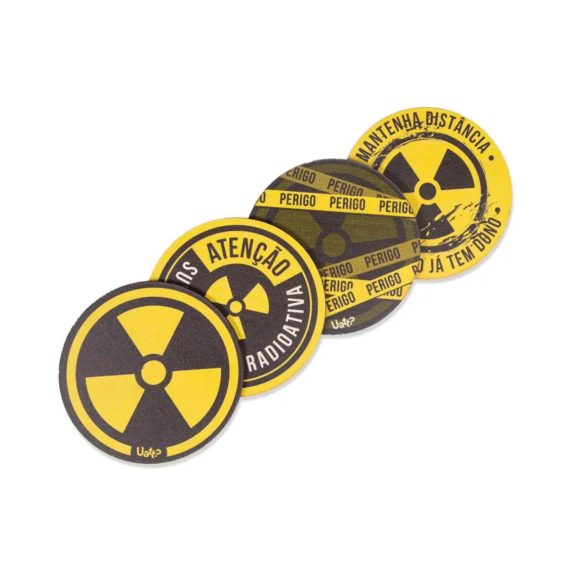 O Porta-Copos - Radioativo possui mensagens divertidas que alertam para o perigo de substâncias radioativas.